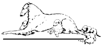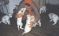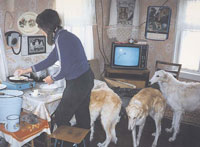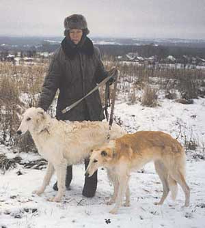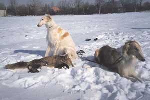 Earlier Nadia had sent me a pretty puppy bitch named Romashka. Although she had some lovely Borzoi features, such as tiny ears, beautiful eyes and a perfect mouth with large molars, I found her to be “weedy” and unsound. I kept her as a housedog but never bred her. It is interesting that when she first arrived, she would literally “eat off the land.” I watched her graze the heads of seed grasses and eat all insects and bugs. This self-preservation instinct was quickly lost after she learned that she would receive two squares, including meat, each day! When I visited Russia, I met Romashka’s sister, Razlouka Novik, a good-quality bitch, and decided that I would prefer a puppy from her if she were bred to Mily. Razlouka is a light self-red Borzoi of lovely quality. She is an outstanding courser and hunter, sweet with people, but she “walks on the wild side.” she turns her dogs loose each morning to run and hunt! They bring back small game, which go into the pot and are stewed for all to share. |