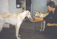 | Learning of my disappointment in Romashka, Nadia offered me the sister. When I learned that Razlouka had killed a few sheep instead of small game while out hunting and like her sister, Romashka, tore fencing with her teeth to escape, I thought it wiser not bring her to New Jersey. Razlouka remained in Russia and was bred to Mily when he matured. Nadia was thrilled with the quality of the nine puppies. However, tragedy struck in the form of a parvo-like virus and the pick puppies were lost. Of the five surviving Nadia kept two and raised to six months of age two bitches and a dog to send to me. | ![]() Judges examining Mily (above) |