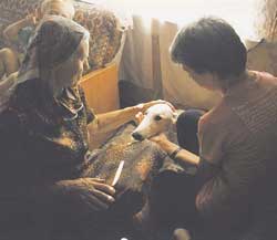 The story actually begins about the time the iron curtain came down. While attending a concert in Leningrad, as St. Petersburg was then called, musician friends of mine, Don and Barbara Mallow, met a woman walking three Borzois. This woman invited the Mallows to attend a Borzoi club meeting and upon their return home, Don, Barbara and I began plans to bring a Russian breeder, Nadia Navakova, to the US. We drew up all of the necessary papers, which included a visa, her purpose for being here, a promise to return to Russia and supplying a health insurance policy for her while here. Nadia fl ew over to spend two weeks at Majenkir in a memorable cultural exchange which included her judging a match for BCNE and being interviewed, complete with a translator, for a full-page article appearing in the NY Times. After Nadia’s return to Russia, several of us discussed the desperate poverty these brave breeders were struggling against. It was obvious that help was needed and so we formed a non-profi t organization, “Save Russia’s Borzoi.” At the time, another Borzoi owner and friend, Pauline Bilsky, began traveling to St. Petersburg with her husband Don, whose business was based in Russia. Pauline took an interest in helping and became indispensable as the go-between. |