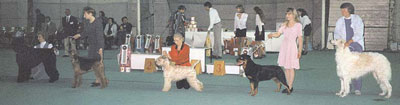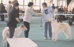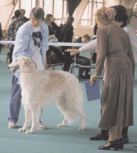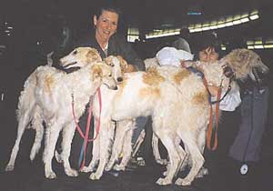 | In 1999 when Pauline visited Russia again, she returned with four Borzois, three of these were the Mily six-month-old pups out of Razlouka, the fourth an unrelated male, Snerzak. Rosha, an elegant and pretty red-spotted bitch, is still in residence at Majenkir kennels. To ship the dogs safely on a direct flight to JFK meant driving from St. Petersburg to Moscow. The only direct flights to the US left from Moscow. A Russian couple, Dimitri and his wife Sofia, Borzoi breeders living in Moscow offered their help. They drove Pauline, her nephew, three puppies and one adult Borzoi to the airport in Moscow in their tiny car! We are indebted to them for their help and assistance. All four Borzois arrived safely at JFK. The adult Borzoi male was Snerzak, Nadia’s Russian-bred, who was being replaced by Mily. Snerzak was placed in a loving pet home in America. I also placed the male puppy, Razliv and one of the bitch puppies, Rosa, in pet homes, where they have adjusted well. It has been agreed that they will be kept intact in the event fate makes a decision and one of them may be needed for a future breeding. | ![]() On his way to winning BOB in St. Petersburg |